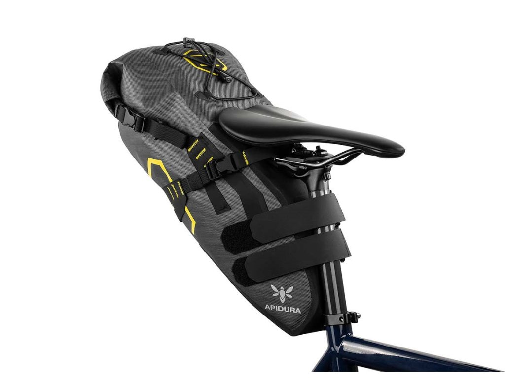 Navrhnutá tak, aby využila celý priestor pod sedlom, a to bez nosiča. Je nepremokavá vďaka odolnému materiálu, ktorý nie je šitý, ale zváraný. Apidura Saddle Pack je vyrobená z vysoko kvalitných, nepremokavých a pevných materiálov. To všetko pri zachovaní mimoriadne nízkej hmotnosti. Najlepšie funguje, ak je vaša výbava dobre zbaliteľná (oblečenie, spací vak), ale je šitá, takže sa nemusíte starať o nakladanie ničoho iného. Cyklistická brašna je vhodná pre cestné, trekingové a horské bicykle. Bez problémov ju môžete namontovať aj na celoodpružený bicykel. Jediným obmedzením je vzdialenosť koľajničiek sedla od zadného kolesa, aby sa zadné koleso počas jazdy nedostalo do kontaktu s brašňou. Trojbodový upínací systém z protišmykového materiálu Hypalon zaisťuje maximálnu stabilitu počas jazdy. Brašna sa upevňuje na koľajnice sedadla a sedlovú trubku kombináciou suchého zipsu a sťahovacích pásikov. Vlastnosti: Veľmi nízka hmotnosť. Nízka hmotnosť. Reflexné prvky pre vašu bezpečnosť. Dve možnosti pripojenia zadného blikača.Dodatočné parametre