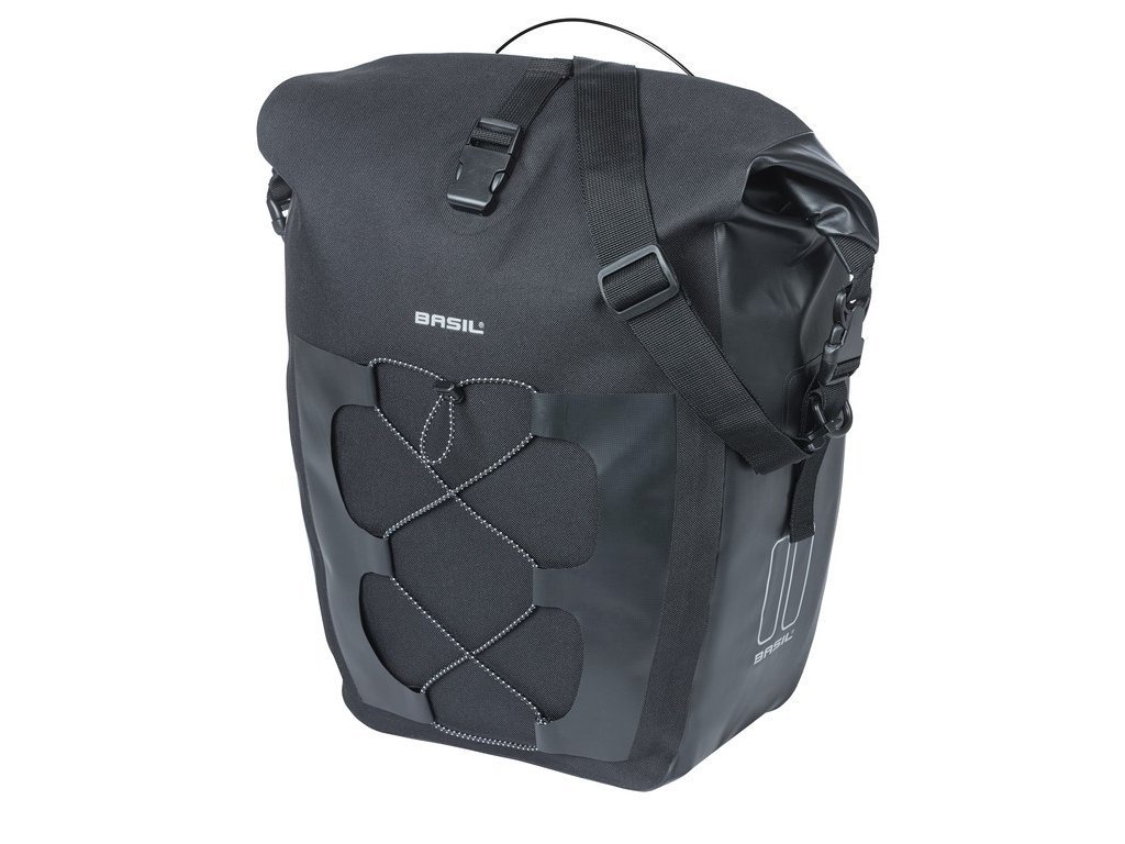 Taška sa uzatvára rolovacím uzáverom. Tento uzáver sa dá otočiť dvoma spôsobmi: smerom k zadnej časti tašky alebo na vrch tašky. Zapínacie uzávery sa dajú používať flexibilne. Cyklistická taška sa pripája k bicyklu pomocou systému MIK Studs. Tašku je možné dodatočne pripevniť k rámu bicykla vďaka extra nastaviteľnému háčiku na spodnej strane tašky. S profilmi MIK môžete na nosič umiestniť nielen tašku alebo košík, ale pomocou MIK Studs môžete na bok nosiča pripnúť aj ďalšie tašky. Vďaka tomu môžete akúkoľvek tašku pripevniť a odstrániť z bicykla za pár sekúnd, bez námahy a bez poškodenia nosiča batožiny. Čo potrebujete? Tašku s MIK Studs a nosič s tromi upevňovacími bodmi. Nemáte tento nosič? Žiaden problém! S samostatne dostupným adaptérom MIK Frame môžete tento praktický systém používať aj tak. Taška je vyrobená z kombinácie plachty a polyesteru 600D a má odnímateľný a nastaviteľný ramenný popruh. Chcete uložiť prilbu alebo mokrý plášť do dažďa? Na prednej strane tašky je reflexná elastická páska. Vlastnosti: Veľká verzia Basil Navigator s objemom 22 litrov. Basil Navigator Waterproof má rolovacie veko s dodatočným nastaviteľným zapínaním. Vďaka rukoväti a ramennému popruhu môžete tašku ľahko prenášať kamkoľvek. Vodotesná (IPX 3). Obsahuje reflexný elastický pás ako predné vrecko.Dodatočné parametre