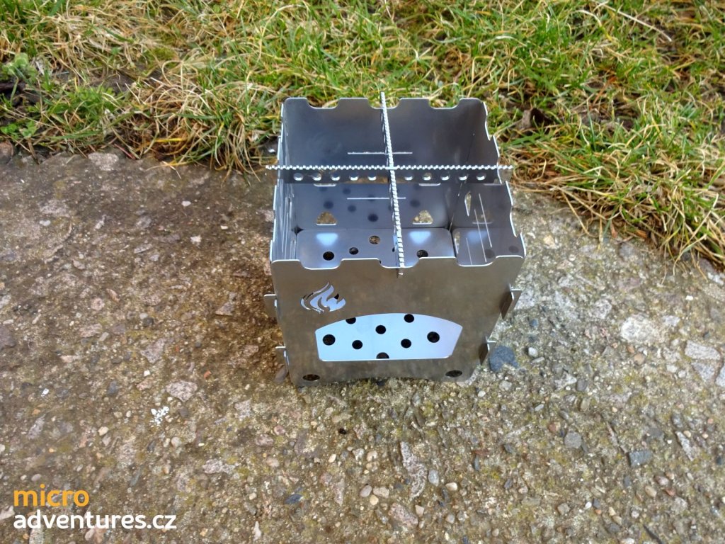 Sklápací varič na drevo, veľký, vhodný na konvicu a hrnec. Skladací na plocho. Vhodný na použitie s malými vetvičkami a pevným liehom vďaka pevnému dnu. Stavebnica bez robenia ohniska.